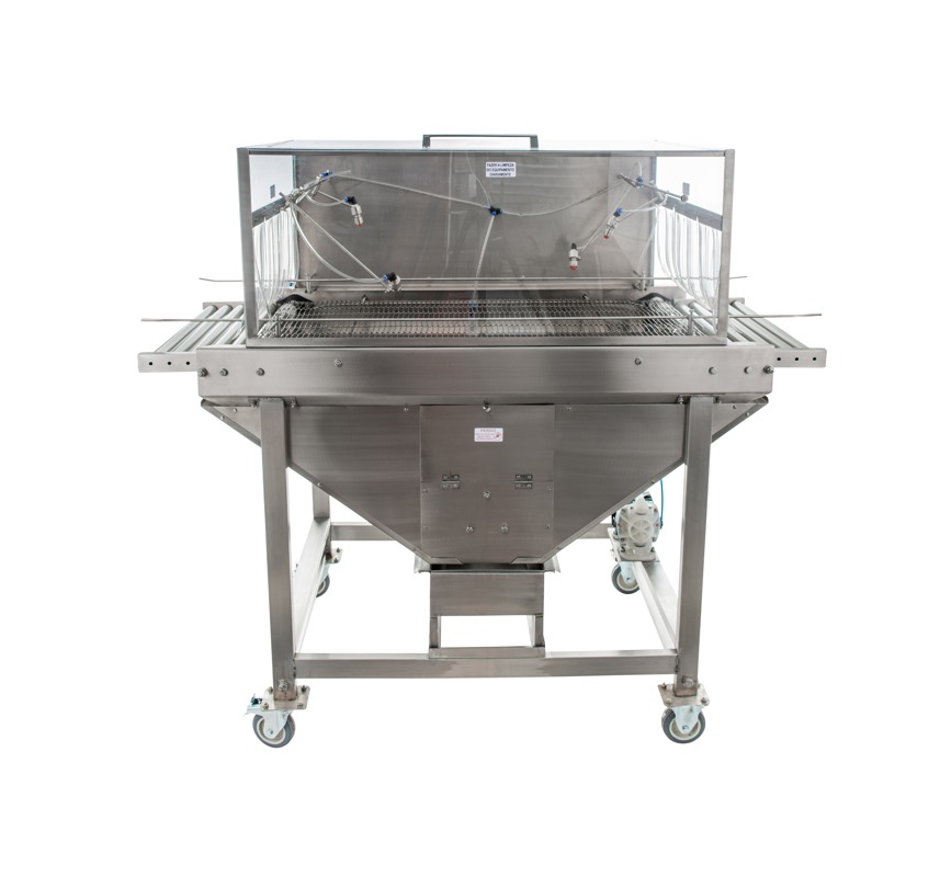Esteira de aço inox 304 com regulagem de altura e de velocidade.